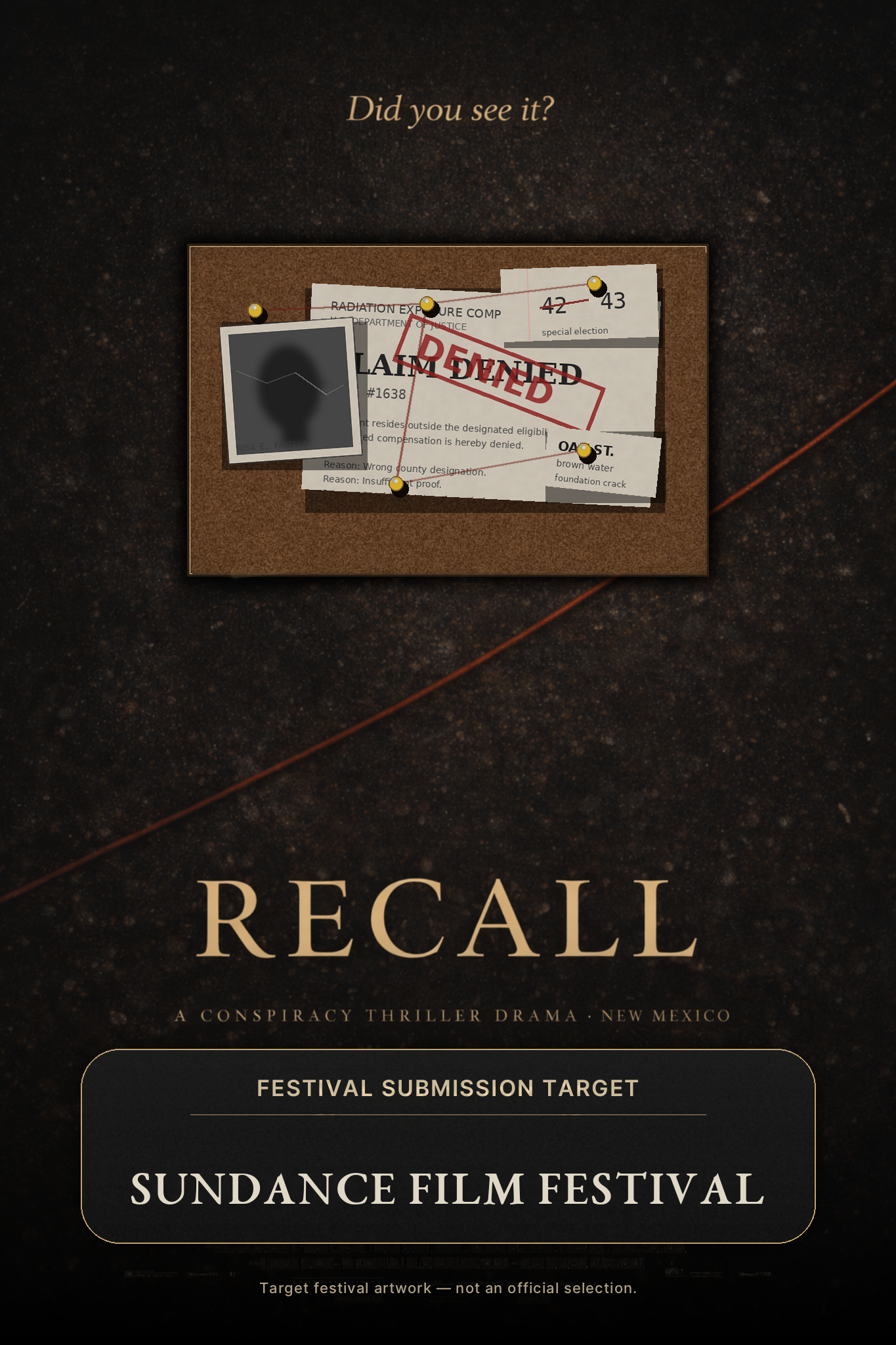 RECALL fits the Sundance programming sensibility: formally precise, politically engaged, character-driven but not conventional. The man-who-sees-patterns-becomes-mayor hook is high-concept enough for trade coverage, but the execution is institutional horror—a grief story disguised as a procedural nightmare. Sundance programmers have historically responded to films that weaponize genre conventions against themselves. RECALL looks like a whistleblower drama and plays like a horror film where the monster is procedure.